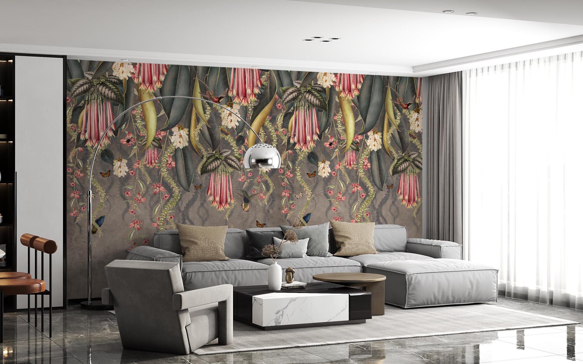 Hangende brings lightness and playful elegance to any room. Delicate flowers and hanging leaves gently unfurl across the wall surface, creating a sense of depth and closeness to nature. The birds and butterflies among the tendrils have a lively effect and lend the motif an almost poetic touch.