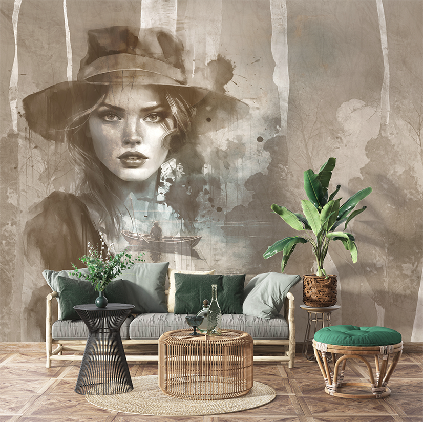 Map combines the charm of historical explorer maps with a modern aesthetic. The detailed depiction of the continents, complemented by fine colour gradients and subtle lines, gives the wall depth and a cosmopolitan touch.