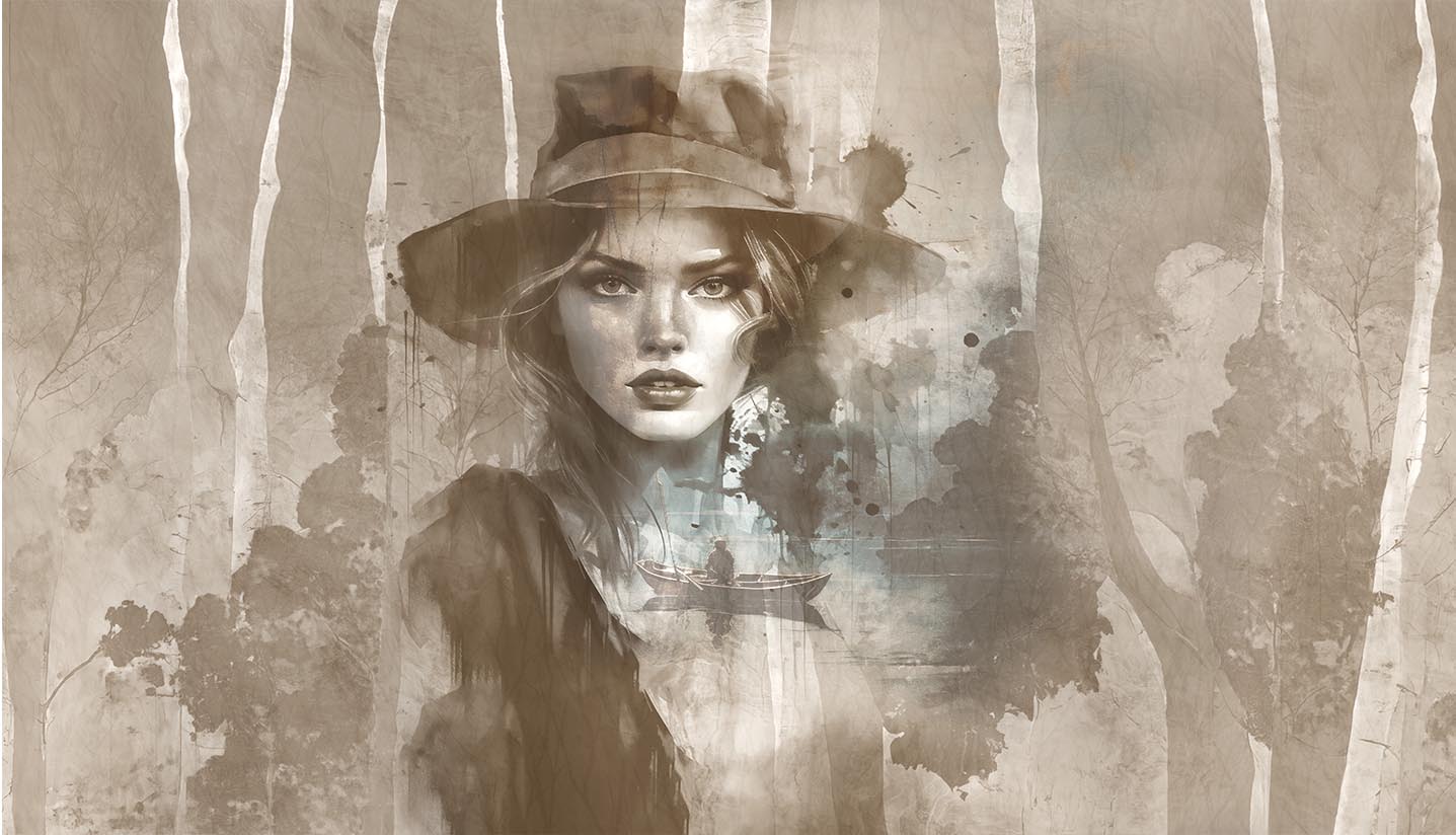 Ein Gesicht, halb verdeckt. Der Blick bleibt verborgen, aber alles andere spricht: der Hut, der Schatten, das Boot im Hintergrund, das durch neblige Wälder gleitet.