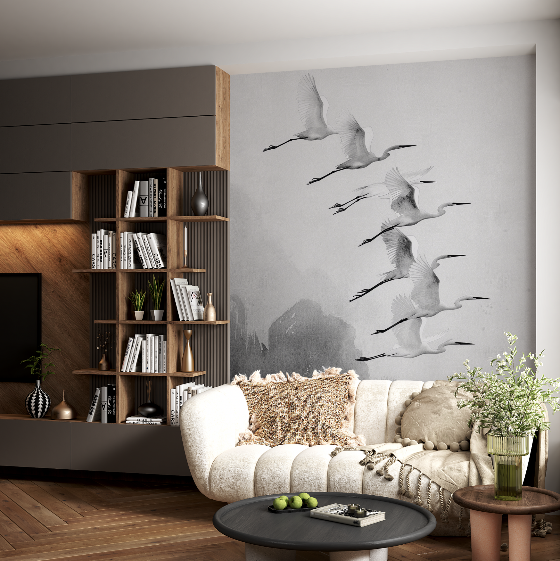 Fein gezeichnete Linien, dezente Texturen und ein Spiel aus Licht und Schatten lassen diese Tapete wie eine stille Unterwasserkomposition wirken. Die anmutigen Umrisse von Skalaren scheinen sich sanft durch das Hintergrundrauschen aus Patina und Tiefe zu bewegen – fast wie ein verborgenes Wandgemälde, das erst beim zweiten Blick seine ganze Schönheit entfaltet.